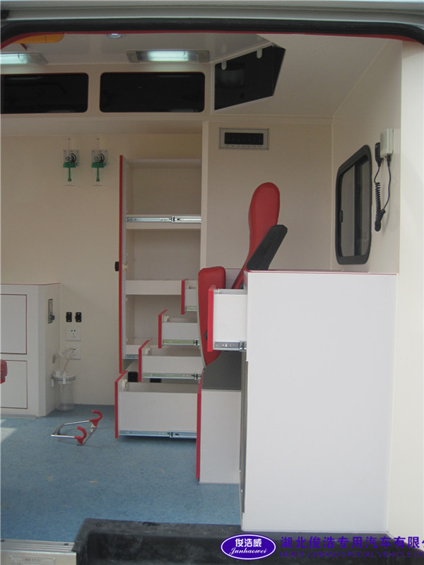 基礎(chǔ)醫(yī)療配置:雙氧氣瓶,自動切換系統(tǒng),氣動負(fù)壓吸引系統(tǒng)(國內(nèi)首創(chuàng)),圓型紫外線殺菌燈,自動上下?lián)艽玻P式擔(dān)架,內(nèi)、外科急救箱。三色器械軟包,折疊式醫(yī)生座椅,三人長條座椅,內(nèi)嵌式輸液盒2個。 警式系統(tǒng)