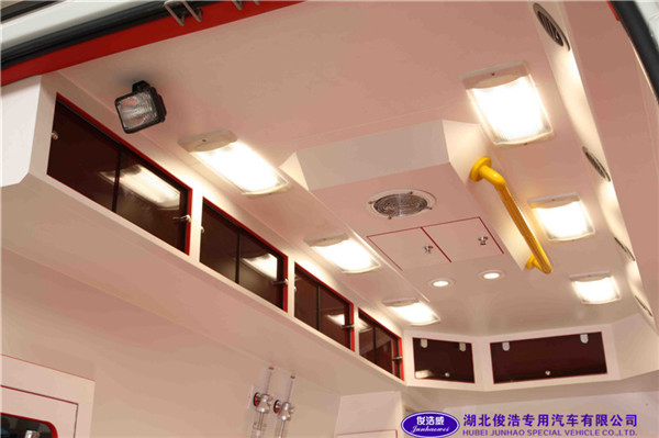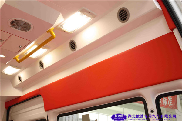 5、駕駛室冷暖空調(diào);醫(yī)療艙結(jié)構(gòu):全套醫(yī)用甲級環(huán)保材料壓模成型,無縫設(shè)計,邊角圓弧處理。整體側(cè)壁系統(tǒng):L型藥品柜,左側(cè)長條吊柜(首創(chuàng)卷簾門),雙氧氣柜,雜物柜,雙層設(shè)備架,頂置多功能模塊,暗藏式一體化洗手池,U型整體防滑易洗地板等。 供電與照明系統(tǒng):智能化薄膜電控系統(tǒng),自動顯示,分級保護,1000W逆變電源(含獨立電池組)可供220V/12V電源,內(nèi)嵌式長條燈組,圓型射燈4個,艙外照明燈4個。 空調(diào)系統(tǒng):頂部下掛出風(fēng)口8組,方向可調(diào),冷熱均勻分流,前后艙獨立控制。
