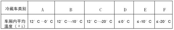 對(duì)于運(yùn)輸易腐食品的冷藏車(chē):當(dāng)環(huán)境溫度為30°C時(shí),按冷藏車(chē)車(chē)廂內(nèi)平均溫度保持的溫度范圍,分為以下六類(lèi):