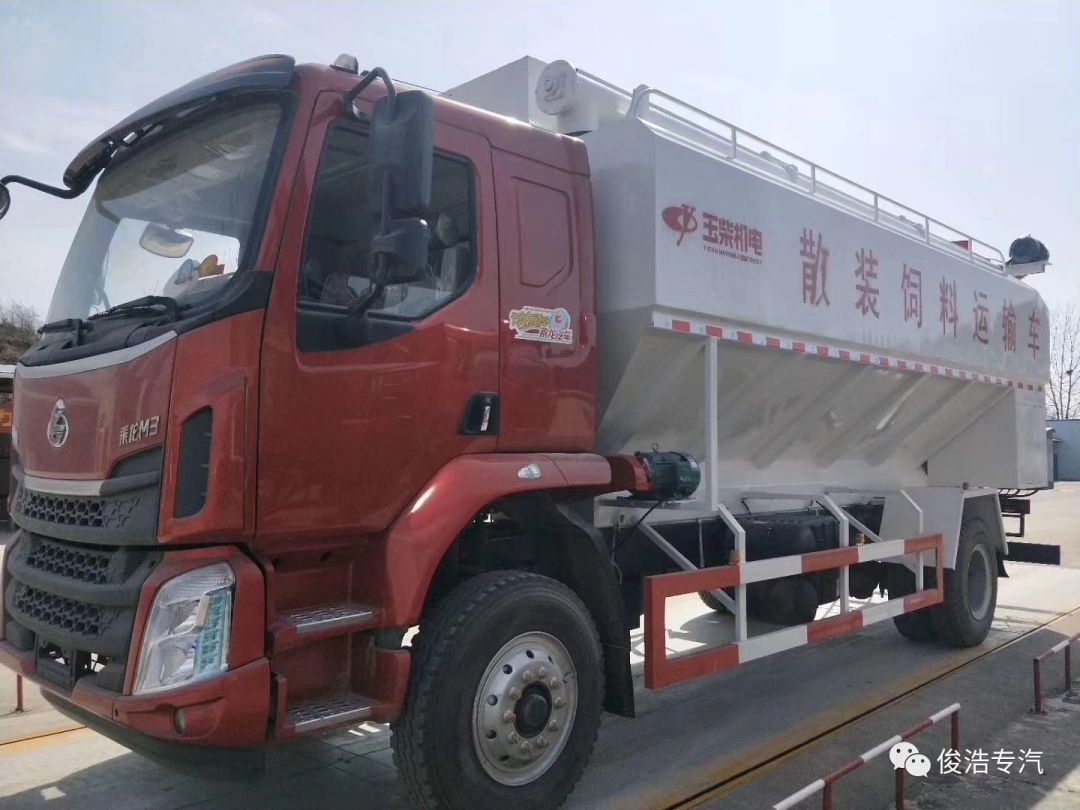28方柳汽乘龍散裝飼料車采用柳汽乘龍新款豪華駕駛室,玉柴6缸200馬力發(fā)動(dòng)機(jī),法士特8檔變速箱,5100mm軸距,10.00R20鋼絲胎,電動(dòng)門窗,中控門鎖,氣囊座椅,ABS,方向助力,斷氣剎;上裝罐體容積約28立方,罐體采用4mm優(yōu)質(zhì)鈦鋼板制作,罐體內(nèi)分為3個(gè)倉(cāng),可獨(dú)立控制各分倉(cāng)卸料順序和速度,整車3條蛟龍(底部水平絞龍、尾部垂直絞龍、頂部卸料絞龍),由3個(gè)5.5kw 380v電機(jī)帶動(dòng)各絞龍工作,頂部絞龍液壓控制舉升,可左右旋轉(zhuǎn)180°,整車尺寸:9100×2500×3800mm,罐體尺寸:6300×2500×2580mm。