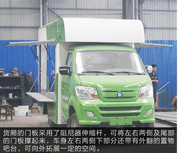 | 1.隨底盤選裝黑色保險杠,帶OBD;該車裝備有售貨窗口,貨架,貨柜,冷柜等專用設施,用于流動售貨的廂式專用作業(yè)車;2.選裝天窗高度為2780mm;不選裝天窗高度為2700mm;選裝雨沿寬度為1940mm,不選裝雨沿寬度為1880mm;3.車身兩側(cè)與車身尾部可增加LED顯示屏,可在車身兩側(cè)任意面開啟售賣窗口;廂體下欄板在售貨作業(yè)時可展開平放以擴展貨臺面積;4.選裝左右兩側(cè)不同結(jié)構(gòu)形式的側(cè)翻門,后門;5.貨廂頂部封閉,不可開啟.可不選裝天窗,不同前額頭造型.車身可噴涂或粘貼宣傳文字,圖案,標識,車身顏色可選;6.發(fā)動機4A15對應的油耗值為8.9L/100mL. |